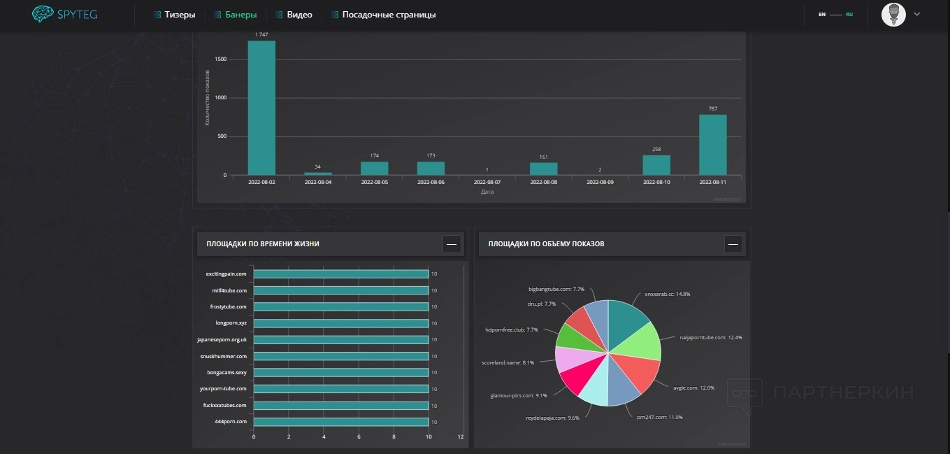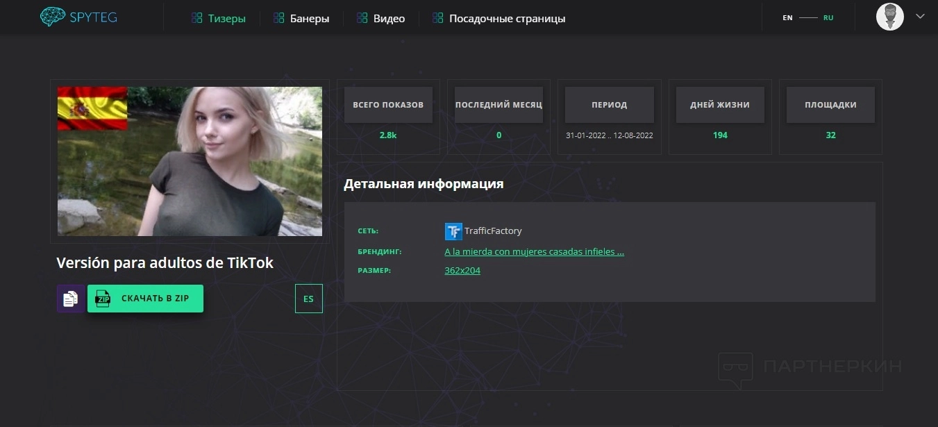 При желании можно скачать объявление в формате ZIP – в архиве хранятся визуал и рекламный текст. Далее можно отследить полный анализ кампании: страны показа, устройства, тренд объявления по дням, площадки по времени жизни и по объему показов. При наличие лендинга его можно просмотреть и полностью скачать в формате ZIP.