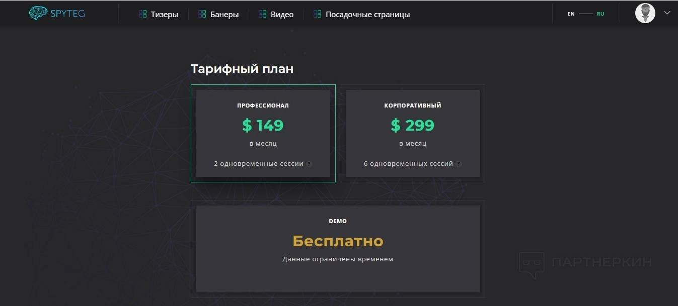 На сайте можно работать без покупки платного доступа в течение 7 дней. В этом случае накладывается лимит на количество объявлений в результатах поиска по креативам. Чтобы снять ограничения, можно выбрать один из предлагаемых тарифов: