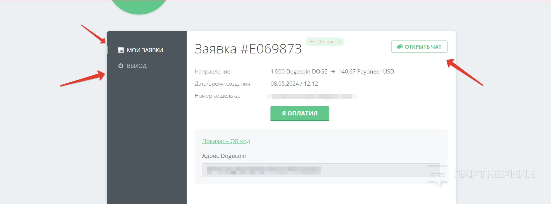 После заполнения заявки пользователь переходит в личный кабинет, где может управлять своими заявками. Здесь доступен раздел с заявками, где можно удалить заявку или подтвердить оплату для завершения обмена. Кроме того, в личном кабинете есть кнопка выхода для безопасного завершения сеанса и кнопка для обращения в службу поддержки в случае необходимости. Этот удобный и функциональный интерфейс делает процесс обмена криптовалюты максимально простым и удобным для всех пользователей