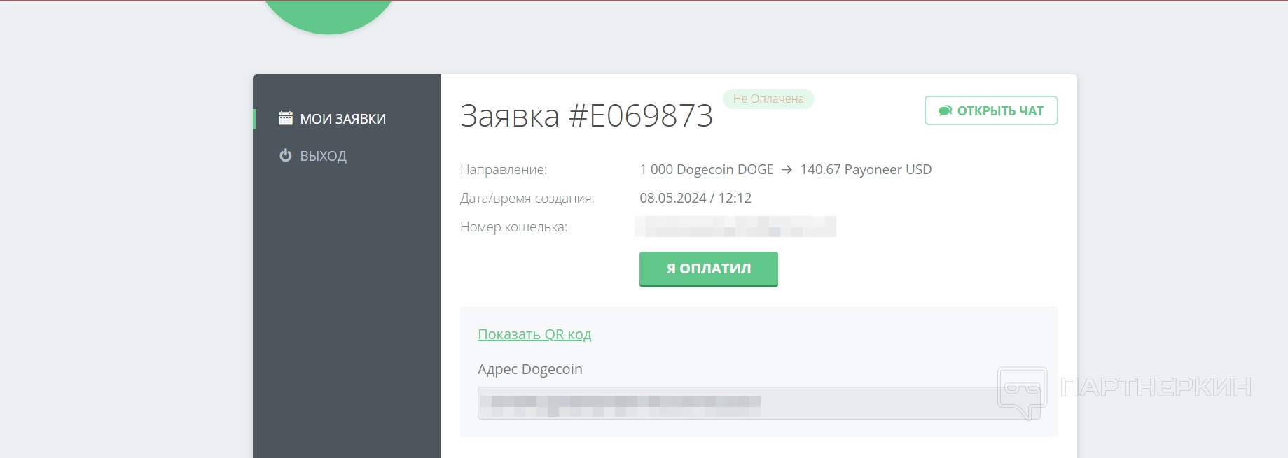 После внесения всех данных пользователь автоматически перенаправляется в свой личный кабинет, где будет указываться его заявка на обмен, а также данные для перевода средств.