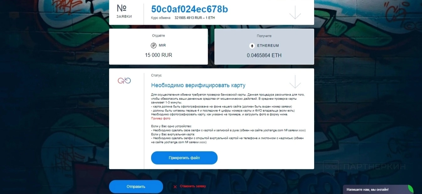После того, как заявка создана, необходимо пройти специальную верификацию для карты или любого другого платежного средства. Для этого выполняется ряд определенных условий (например фото карты под определенным углом и так далее), после чего можно отправлять заявку в работу. Если клиент зарегистрирован в