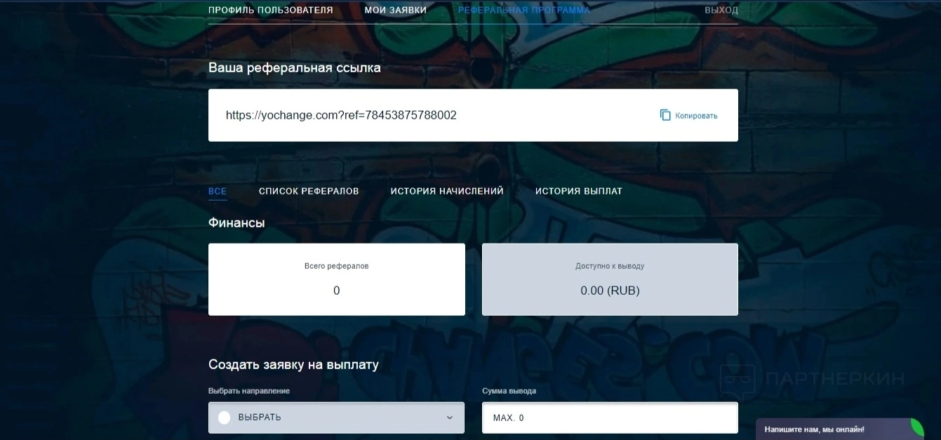 - реферальная программа — последний раздел, где содержится персональная ссылка и отображаются все заработанные средства в рамках программы.