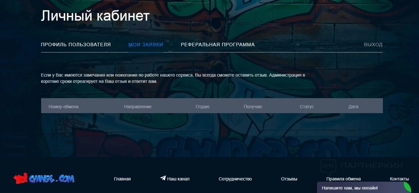 - мои заявки — здесь будут отображаться все созданные клиентом заявки на обмен валюты, а также их статус обработки и другие необходимые детали;