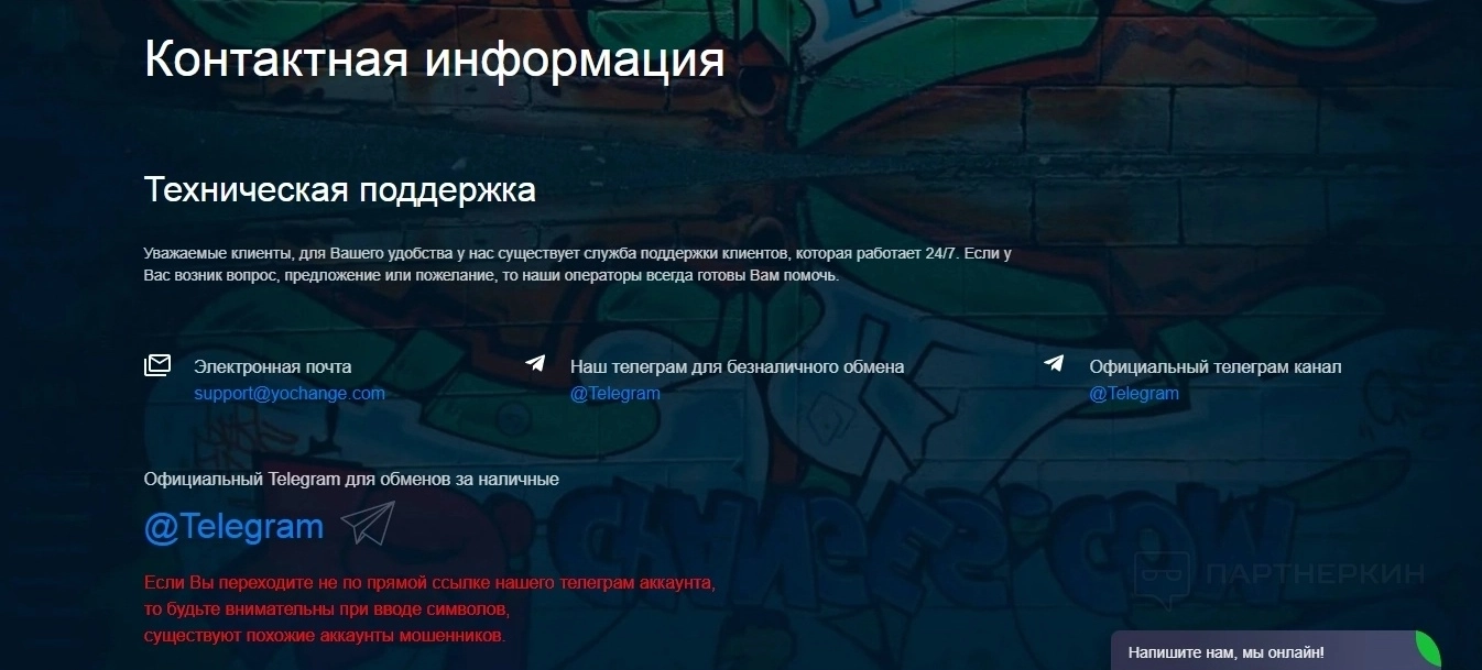 support@yochange.com— официальный адрес электронной почты для обращения по возникшим трудностям или для предложений по сотрудничеству;
