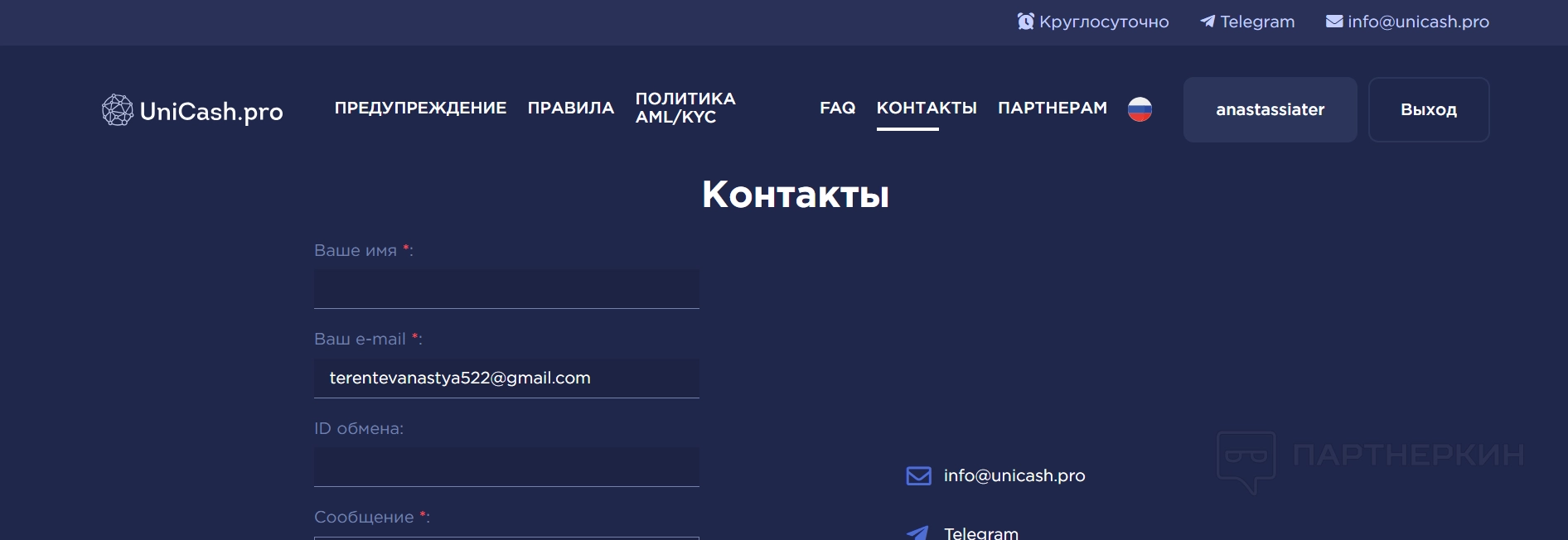 Контакты — в этом разделе представлена контактная информация обменника, включая адреса электронной почты, Телеграм и контактные формы обратной связи. Это позволяет пользователям связаться с поддержкой в случае возникновения проблем или вопросов.