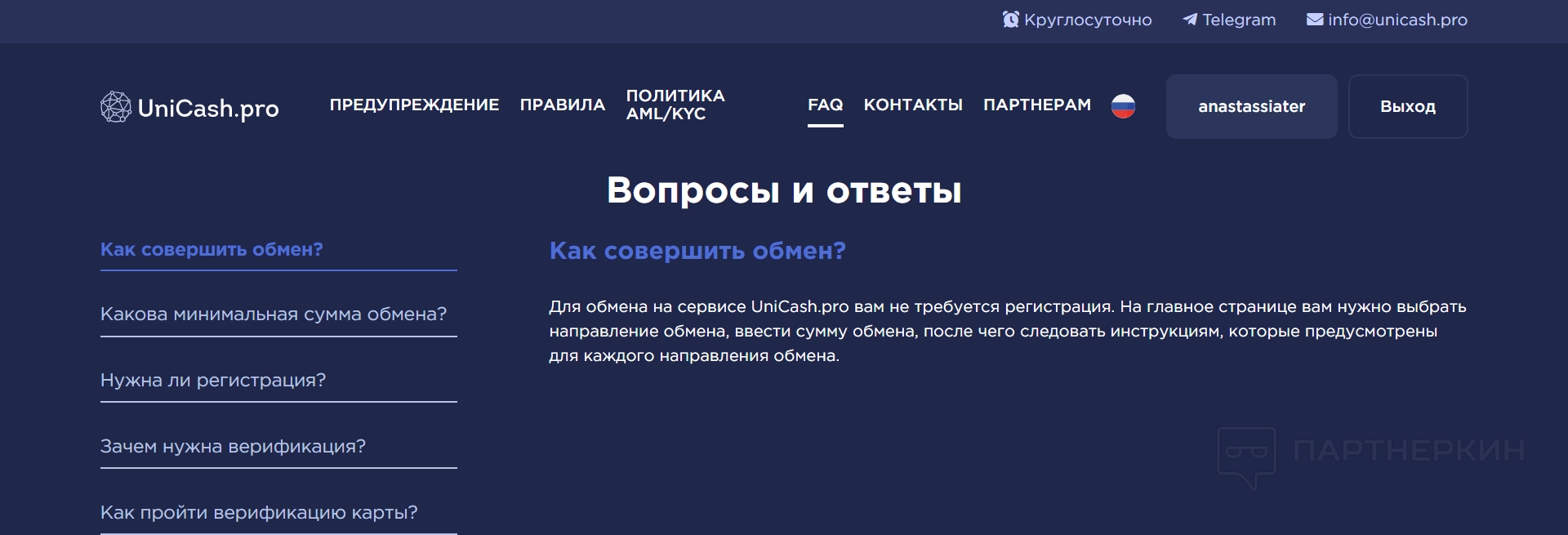FAQ (Часто задаваемые вопросы) — раздел FAQ содержит ответы на часто задаваемые вопросы пользователей о работе обменника, процессе обмена, комиссиях, безопасности и других важных вопросах. Это помогает пользователям быстро найти ответы на свои вопросы без необходимости обращаться в службу поддержки.