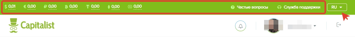 Панель уведомления состоит из нескольких блоков. В первом блоке отображаются поддерживаемые счета, а также раздел с частыми вопросами и служба поддержки. Там же можно переключить язык интерфейса.