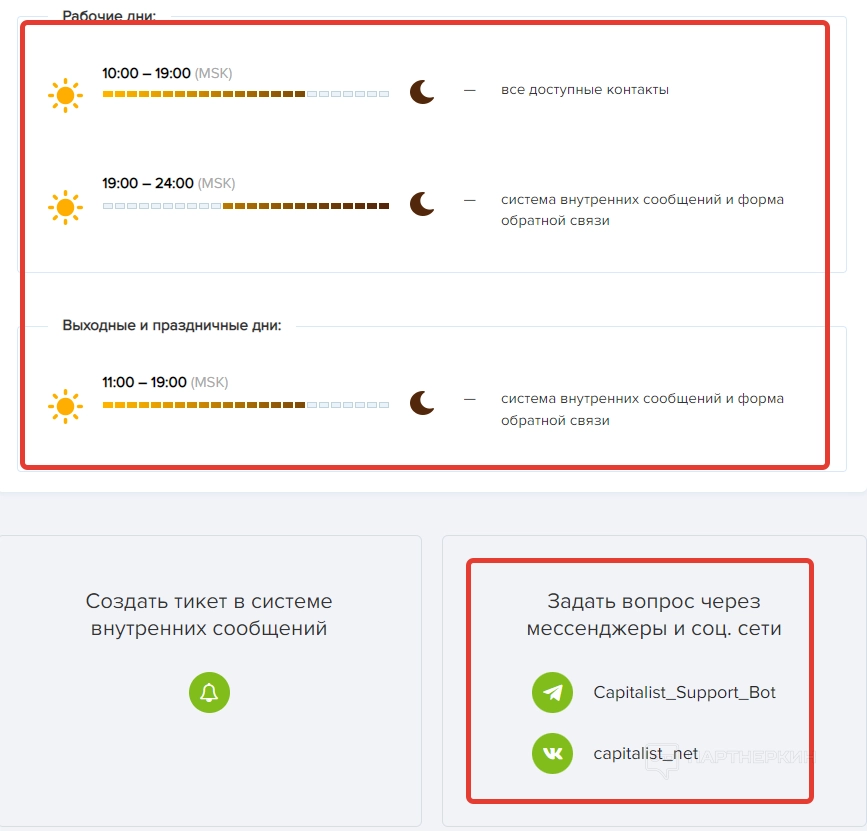 Если нужно задать вопрос, тыкаем на «Служба поддержки». После этого пользователь попадет на страничку, где будет график работы и способы связи. Со срочными обращениями лучше обращаться в