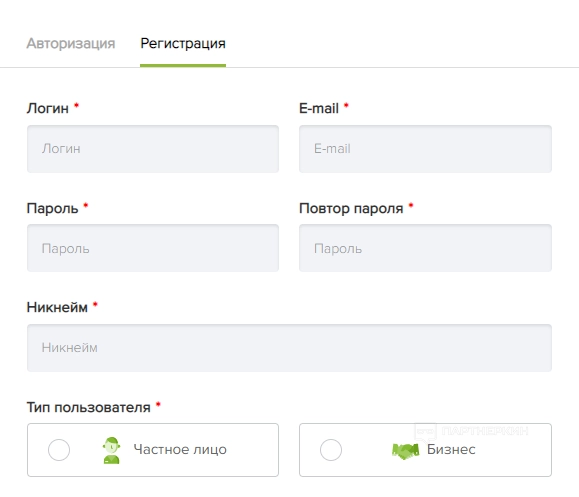 Далее нужно ввести логин, электронную почту, пароль, никнейм и выбрать тип пользователя (частное лицо или бизнес). Также пользователю придется выбрать сферу деятельности.