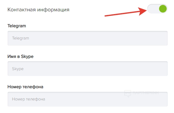 При необходимости можно добавить контактную информацию. Для этого жмем на соответствующий тумблер и вписываем данные