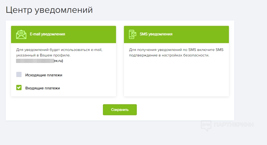 В блоке «Центр уведомлений» владелец аккаунта может настраивать параметры рассылки. Письма с информацией о переводах отправляются на электронную почту или через SMS-уведомление.