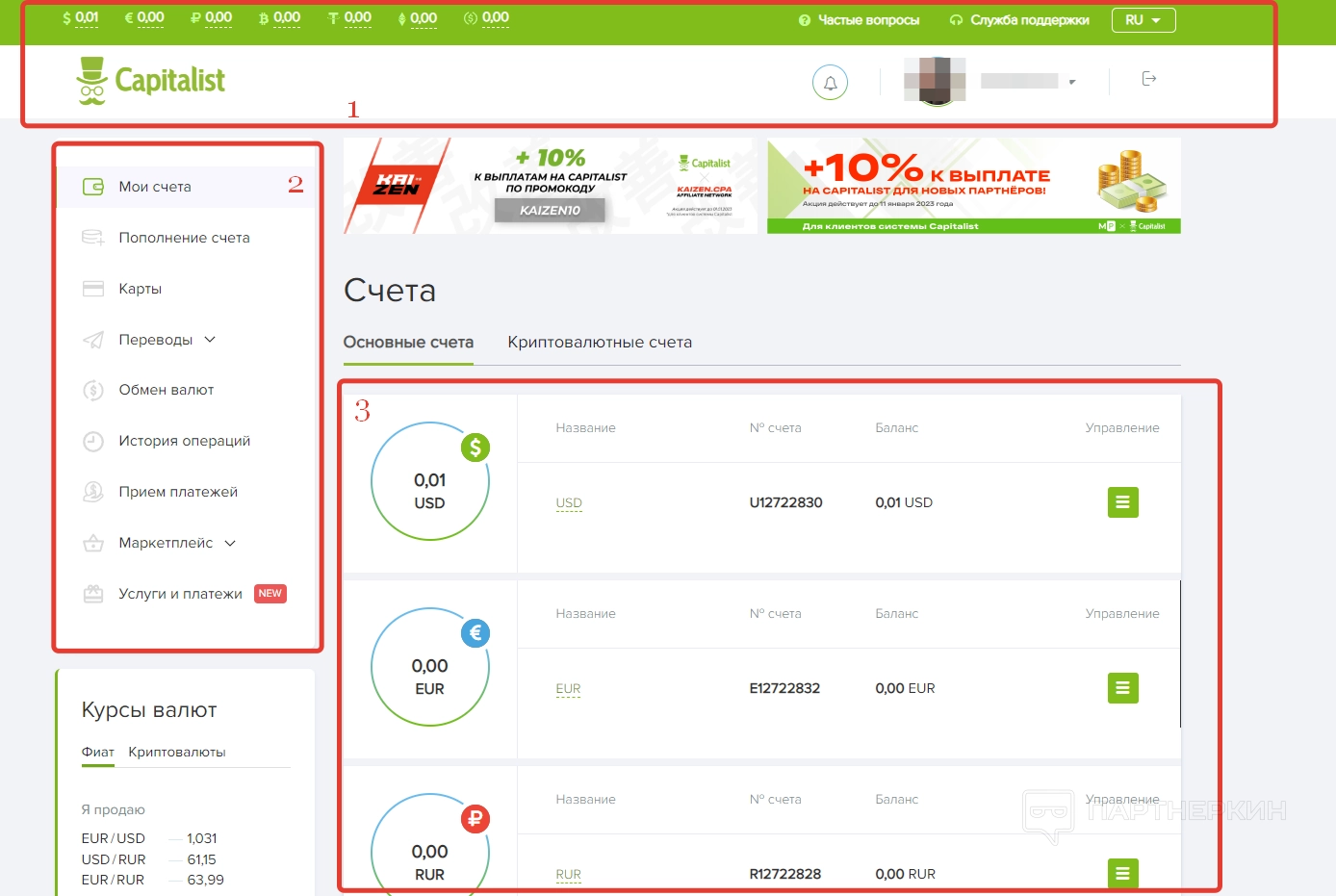 Под панель управления можно найти блок с текущим курсом валют, информацию о партнерской программе и раздел с новостями.