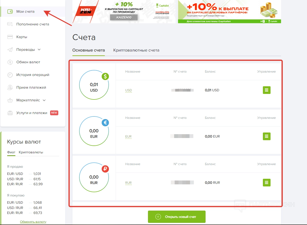 Проводить все финансовые манипуляции пользователь сможет после создания учетной записи. Когда аккаунт будет создан, у юзера появится личный кабинет, в котором будут разные счета для переводом.