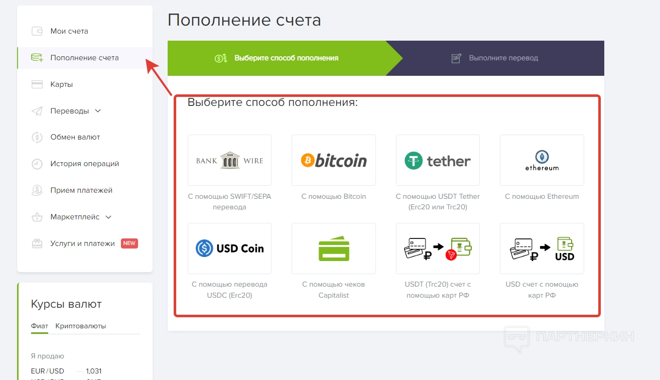 • счет — RUB, USD, USDT, USDC, BTC, ETH.