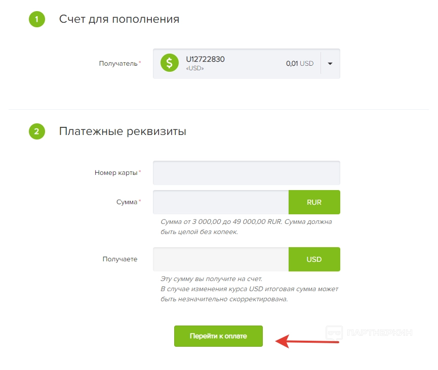 Разберем пополнение на примере USD счета с помощью карт РФ. Для этого жмем на соответствующий раздел и выполняем следующие действия: