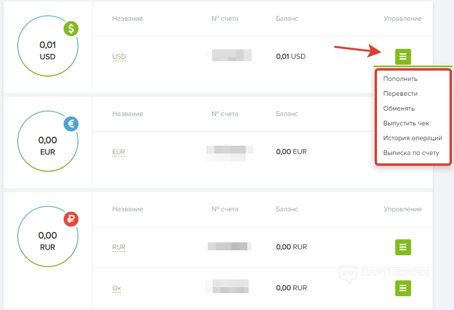 Напротив каждого счета есть кнопка управления, позволяющая выполнять следующие действия: