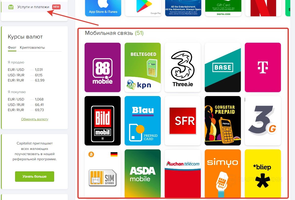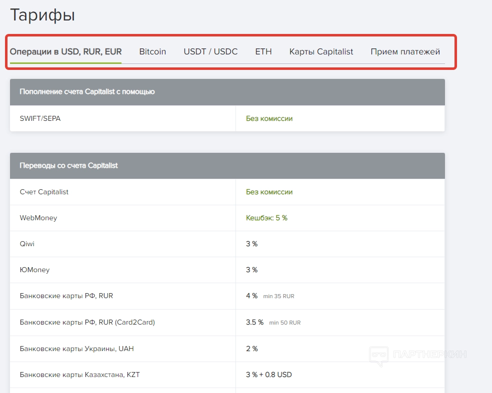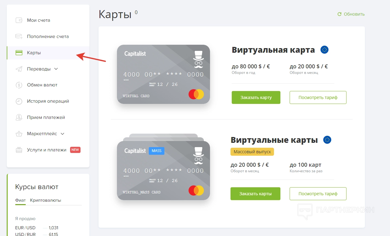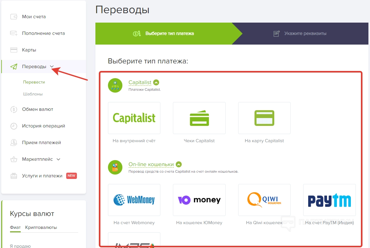 — переводы на внутренние счеты, чеки и карты Capitalist;