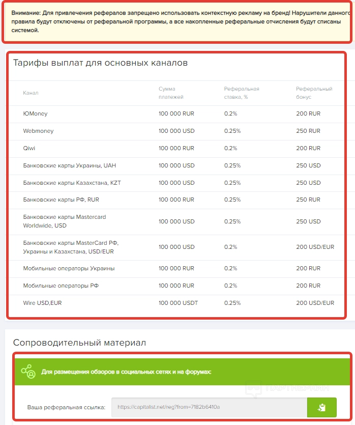 Последний раздел — «Реферальная программа». Здесь пользователь найдет партнерскую ссылку, условия программы и тарифы выплат для основных каналов.