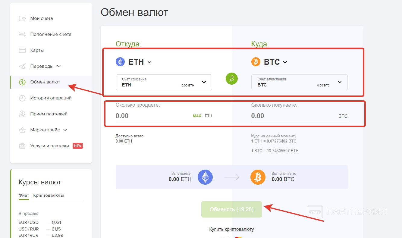 Блок «Обмен валют» позволяет переводить сбережения с одного своего кошелька на другой. На момент написания статьи обмен был возможен между криптовалютами ETH и BTC. Для перевода выбираем пару, указываем сумму и жмем кнопку «Обменять».