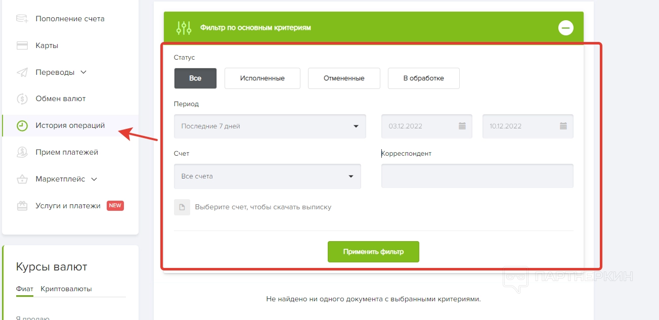 Раздел «История операций» хранит сведения, касающиеся всех финансовых транзакций в рамках аккаунта. Информация фильтруется по нескольким параметрам: