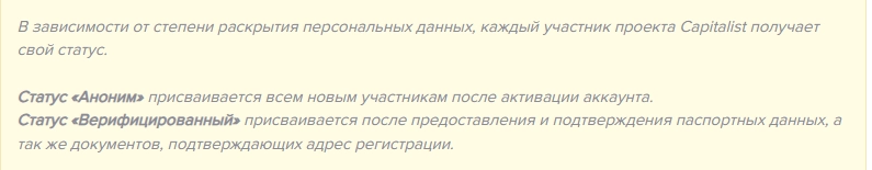Каждому новому аккаунту присваивается статус «Аноним». Пользователь в этом случае может работать с сервисом, однако некоторые функции будут ограничены. Чтобы снять ограничения, необходимо получить статус «Верифицированный». Для этого владелец аккаунта должен предоставить паспортные данные, подтверждающие адрес регистрации, в разделе «Персональная информация».