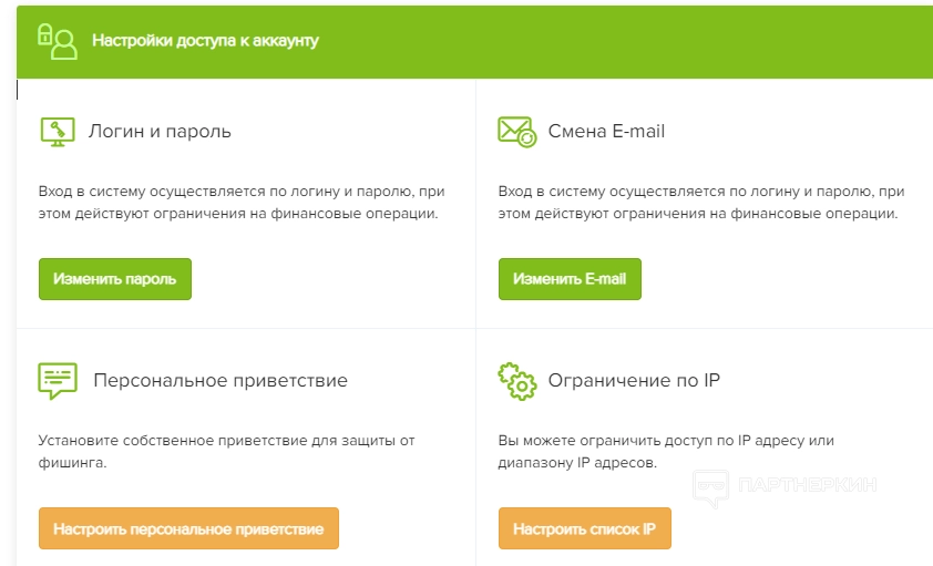 • Настройки доступа к аккаунту. Здесь можно менять логин, электронную почту и пароль, устанавливать персональные приветствия и ограничивать доступ по IP-адресам.