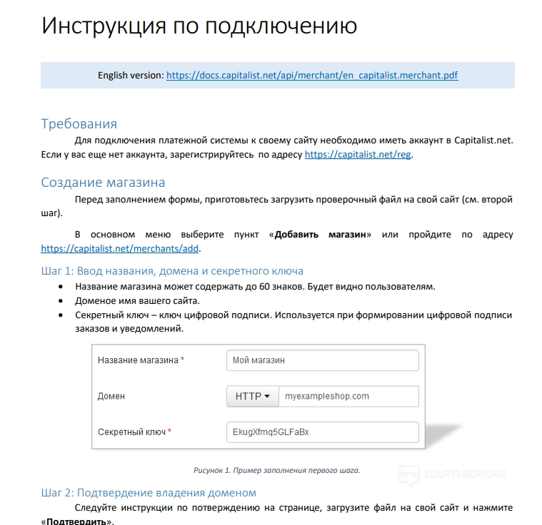 2. Техническая документация — содержится информация, выступающая в качестве инструкции по подключению сервиса.