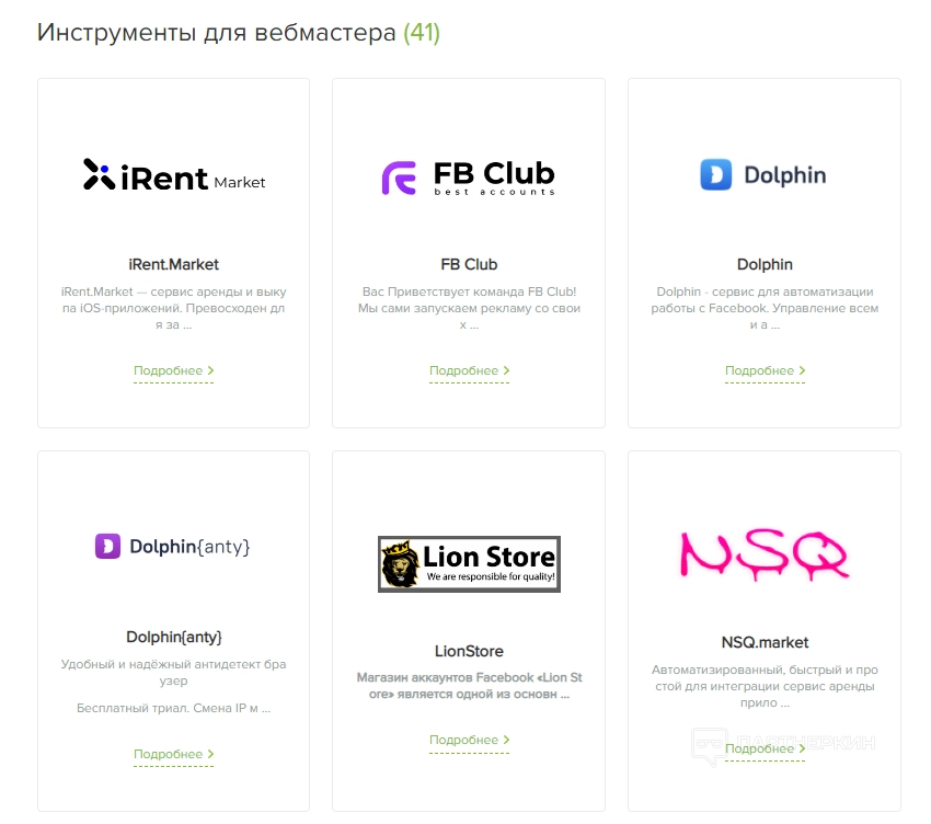 1. Все сервисы — в этой вкладке содержатся разные сервисы и инструменты, которые будут полезны арбитражникам, вебмастерам и прочим специалистам. Сервисы разбиты по категориям. Есть, например, инструменты для вебмастеров, рекламные сети, криптовалютные биржи или сервисы для обмена валюты.