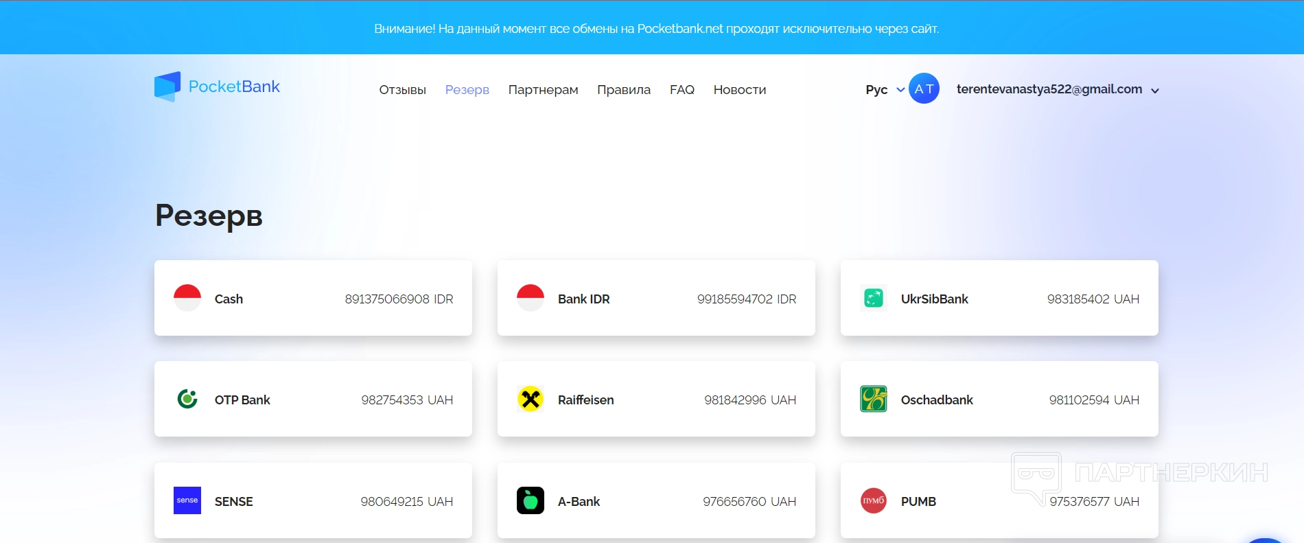 «Резерв» — это раздел, где отображается текущий объем доступных средств для проведения обмена на платформе. Пользователи могут увидеть наличие криптовалюты и фиатных средств для различных валютных пар, что обеспечивает прозрачность и доступность для проведения операций.