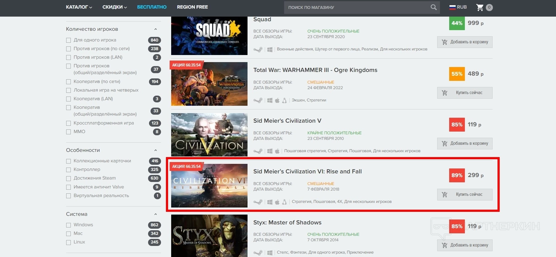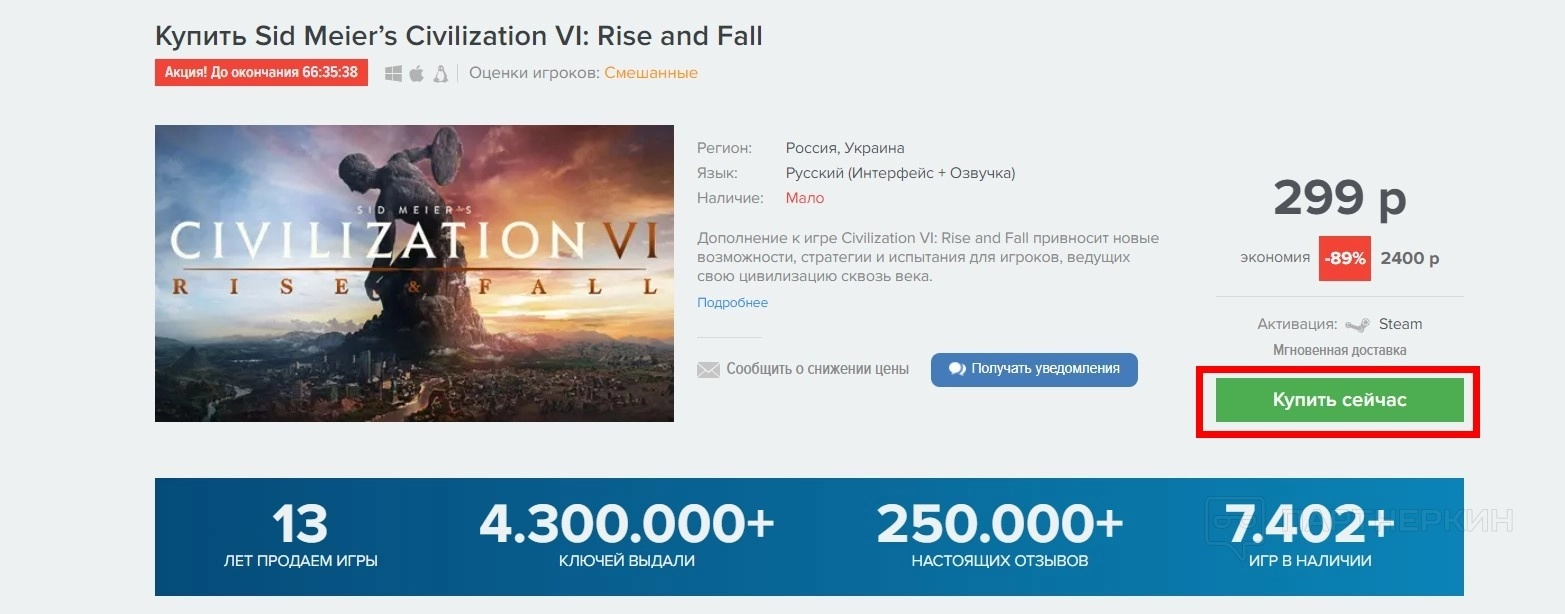 - На сайте представлен широкий ассортимент игр, дополнений и других цифровых товаров. Каждая позиция сопровождается детальной информацией: наличием, возможностью моментальной доставки и дополнительными инструкциями для активации. Например Civilization VI.