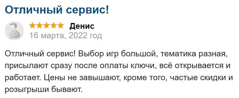 Большинство клиентов хвалят сервис за несколько ключевых преимуществ: адекватные цены, простоту и прозрачность системы покупок. Также за широкий выбор лицензионных ключей. Многие отмечают наличие скидок, акций и возможность покупки игр для разных платформ.