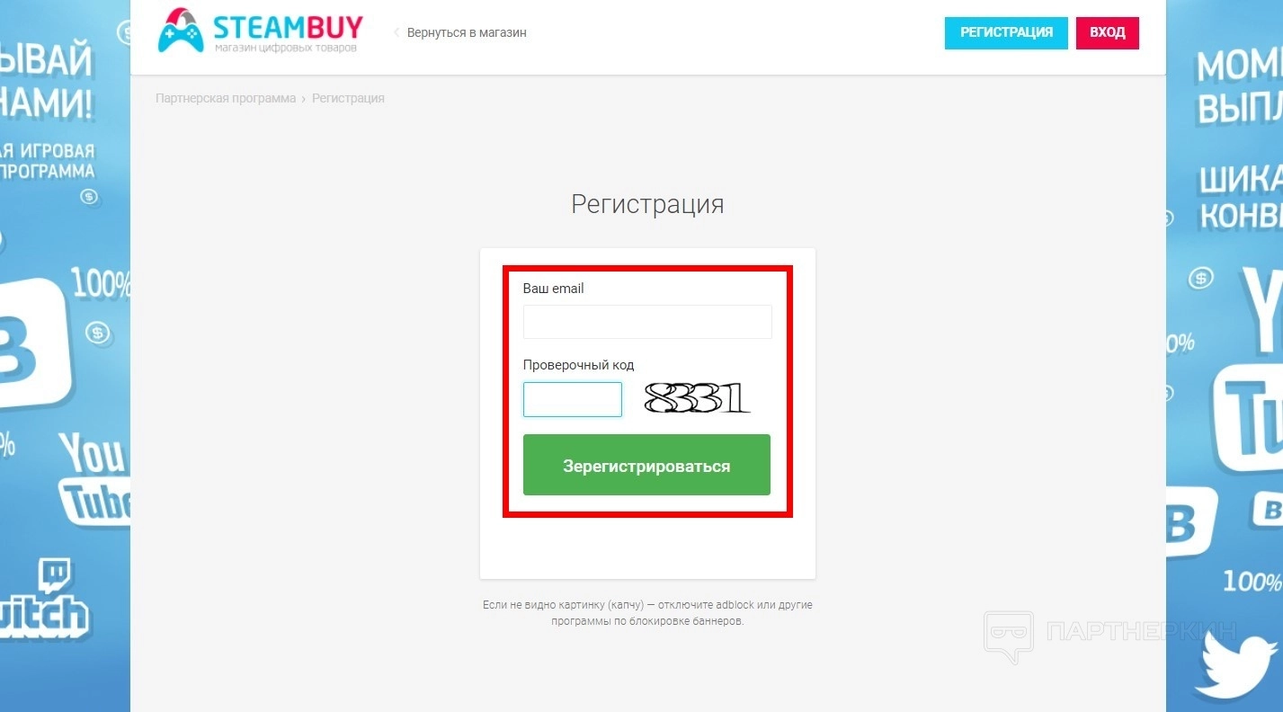 - Заполните регистрационное поле: ваш email и проверочный код. Нажмите на кнопку «Зарегистрироваться».