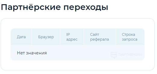 Партнерские переходы . В этом разделе доступна статистика по переходам партнеров: дата, браузер, IP-адрес, сайта реферала, строка запроса.