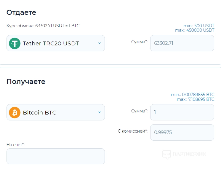 Для обмена валюты нужно открыть главную страницу сайта. Здесь необходимо выбрать валюту. Представим, что пользователь хочет обменять Tether TRC20 USDT на Bitcoin: