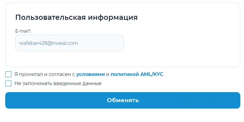 Откроется страница, где нужно указать сумму обмена, ввести номер счета и согласиться с условиями и политикой AML/KYC.