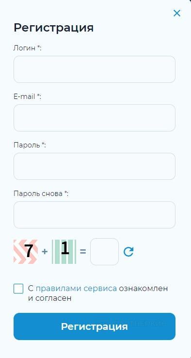 Чтобы создать учетную запись, необходимо нажать кнопку «Регистрация» в правом верхнем углу сайта. Откроется пустая форма, где нужно сделать следующее: