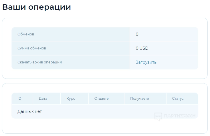 Ваши операции . На этой странице представлена статистика финансовых операций: количество обменов, общая сумма, статус и другая полезная информация. Также можно скачать архив операций по кнопке «Загрузить».