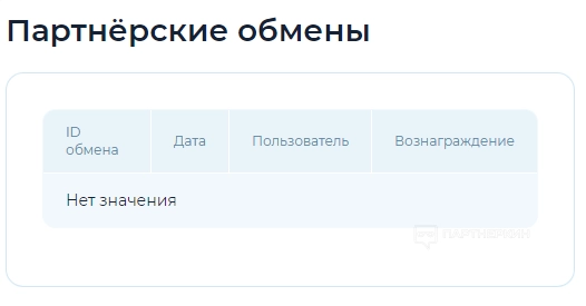 Партнерские обмены . Здесь можно посмотреть ID обмена, дату, пользователя и вознаграждение.