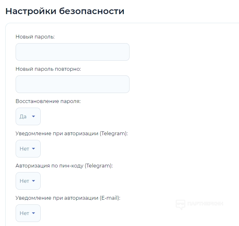 Настройки безопасности . Здесь можно изменить пароль и включить следующие функции: