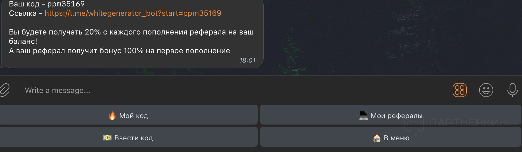 Также можно получить код для рефералов и получать 20% от суммы пополнения каждого, кто его активировал. К тому же реферал получает +100% к первому пополнению баланса.