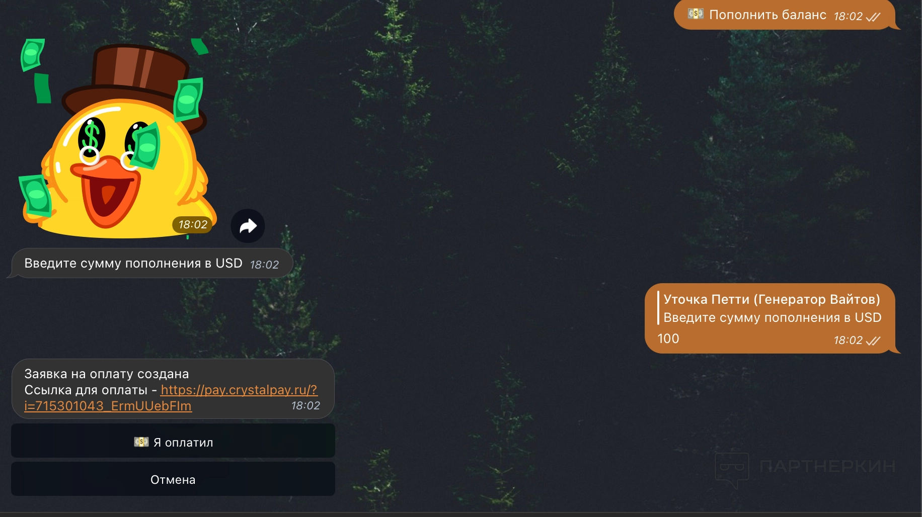 По кнопке «Пополнить баланс» бот выдает ссылку на оплату на нужную сумму: