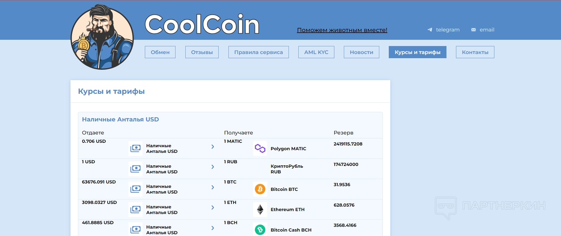 Курсы и тарифы. Здесь пользователи могут ознакомиться с текущими курсами обмена криптовалюты.