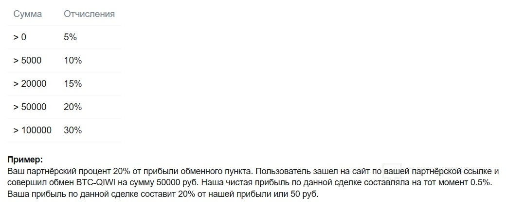 Партнерская программа состоит из 5 уровней. Уровень зависит от общей суммы обменов, совершенных по реферальной ссылке пользователя. Чем больше обменов, тем выше процент от прибыли начисляется пользователю. При достижении определенного уровня, он закрепляется за пользователем навсегда или до тех пор, пока не будет улучшен.
