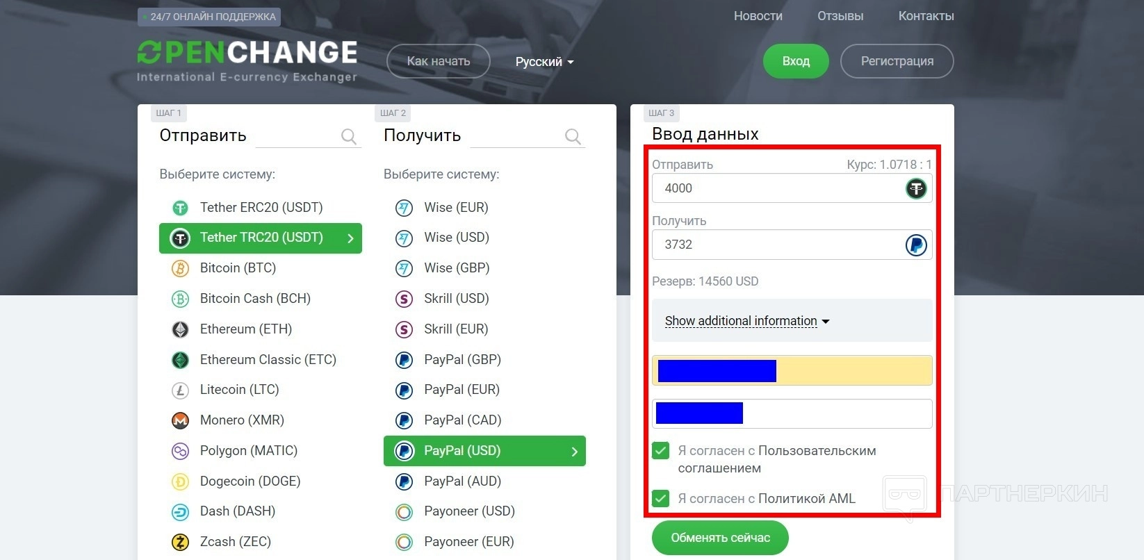 - Заполните форму. Введите общую сумму, укажите свою электронную почту, согласитесь с пользовательским соглашением и политикой AML. Плата за перевод и обслуживание будет автоматически рассчитана.