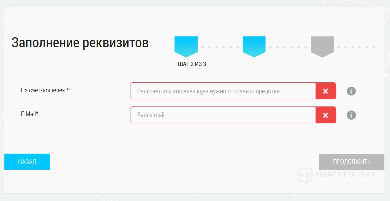 Следующий шаг — это заполнение реквизитов. Нужно указать адрес кошелька для зачисления криптовалюты и электронную почту. Это важный этап, поскольку ошибка в этих данных может привести к потере средств.
