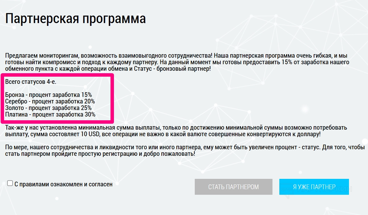 Данная программа рассчитана на всех, кто готов сотрудничать с платформой, будь то профессиональные мониторинговые сервисы или отдельные пользователи. Существует четыре статуса партнеров: бронзовый (15% дохода), серебряный (20%), золотой (25%) и платиновый (30%). Процент заработка зависит от объема операций партнера, а минимальная сумма для вывода составляет 10 USD.
