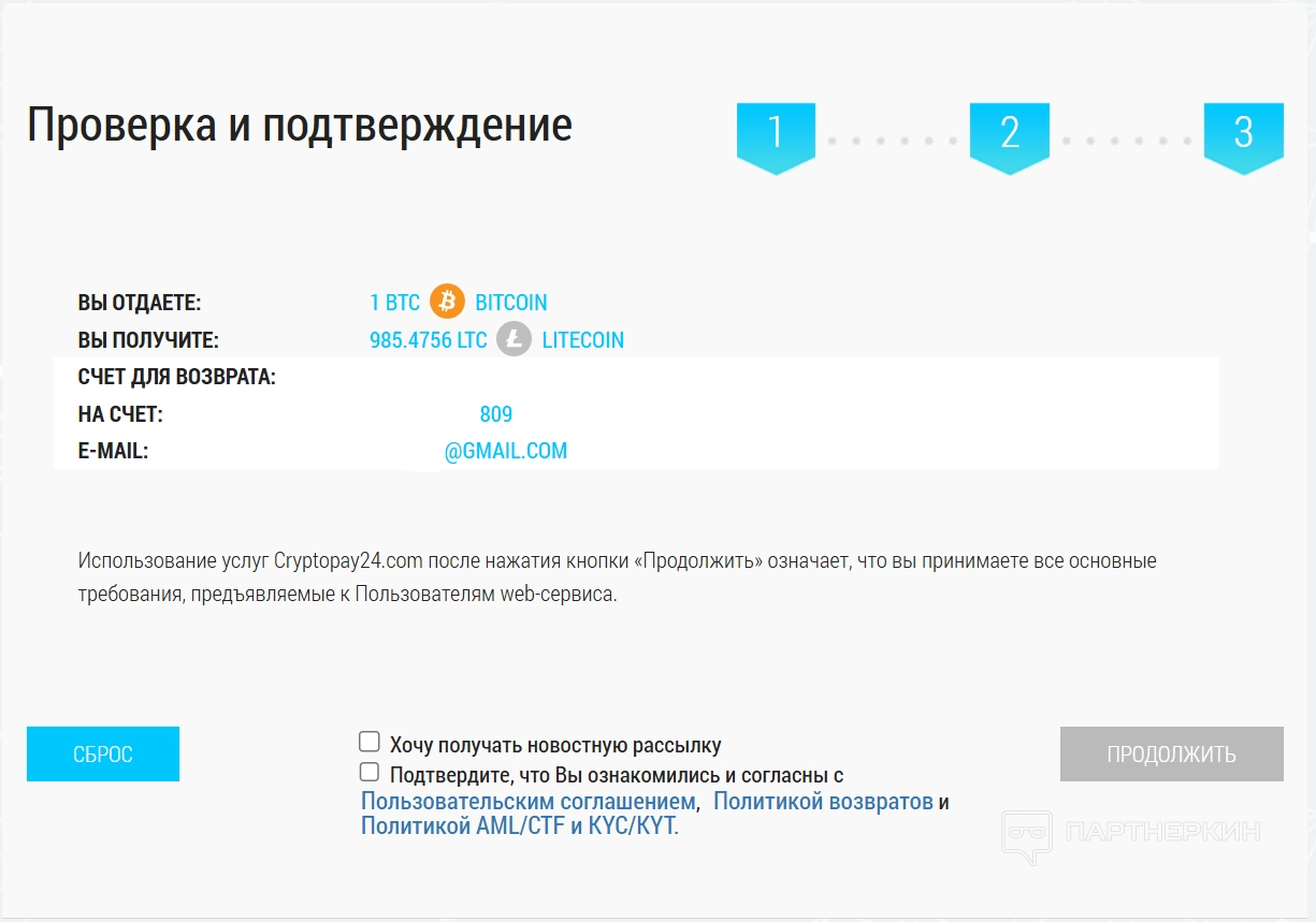 Перед запуском обмена сервис предлагает еще раз проверить все данные: суммы, валюты, адрес кошелька и другие детали. Это последний шанс исправить ошибки, если они были допущены. После подтверждения операция запускается, и в течение 30 минут средства поступают на указанный кошелек. Если вдруг операция требует больше времени (например, из-за задержек в сети блокчейна), платформа информирует об этом.