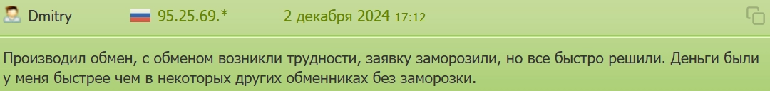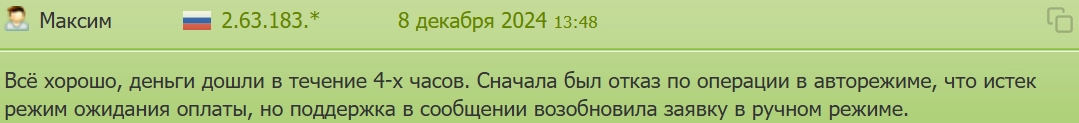 Многие отмечают, что даже при технических сбоях, таких как истечение времени ожидания оплаты, заявки быстро возобновляются вручную, а средства поступают в срок, зачастую быстрее, чем в других обменниках.