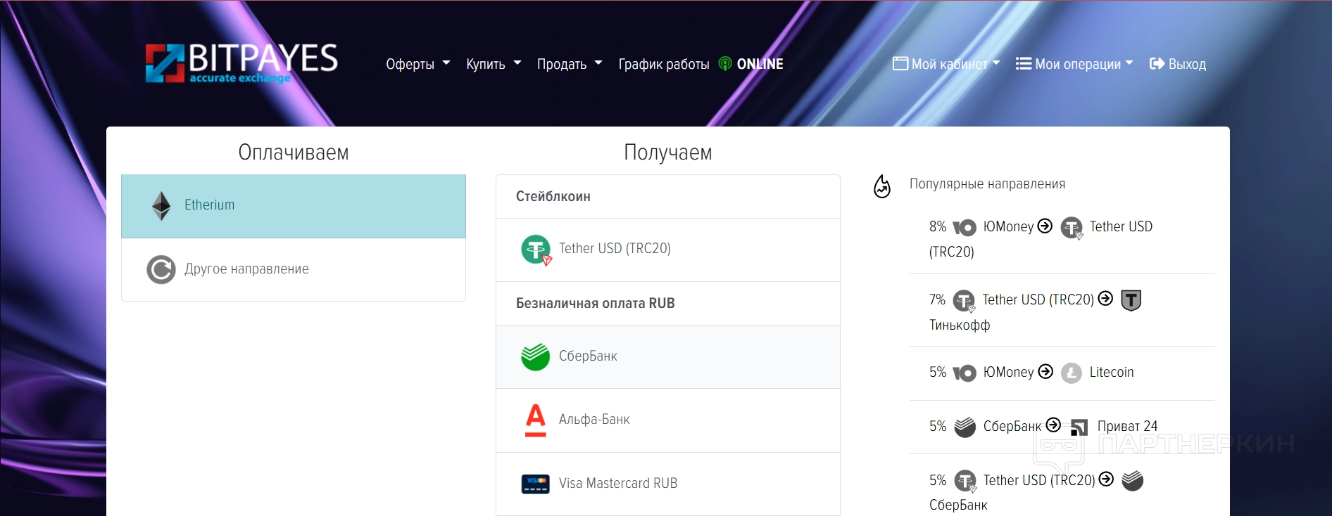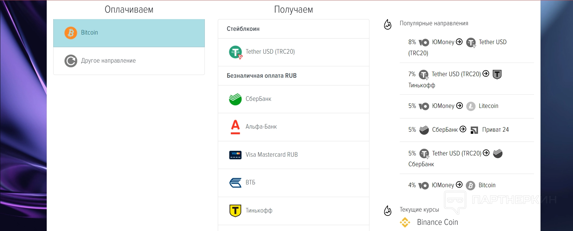 - Широкий выбор пар и направлений. Пользователи могут обменивать криптовалюту на фиат, другие криптовалюты или стейблкоины. Сервис поддерживает популярные банки, электронные платежные системы и международные переводы.