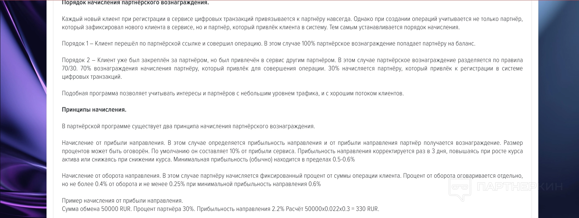 Начисления происходят по двум схемам: от прибыли (до 10% от дохода направления) или от оборота (фиксированный процент от суммы сделки). Например, при обмене на 50 000 рублей комиссия может составить до 330 рублей, в зависимости от условий.